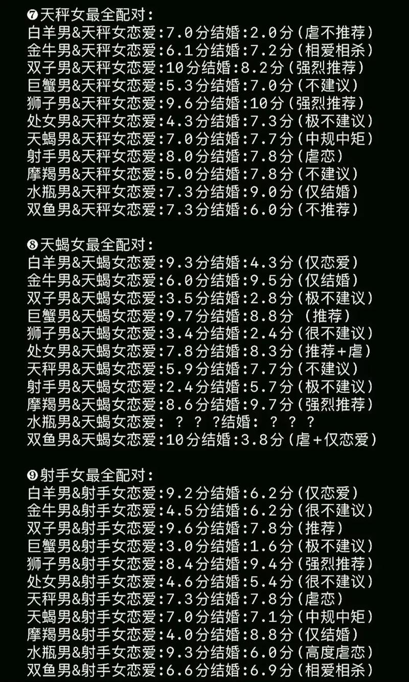双鱼座的人浪漫、敏感,他们在婚姻中追求的是理解和包容。与巨蟹座、天蝎座或双鱼座的配对能够满足双鱼座的需求,共同营造浪漫的家庭氛围。但与白羊座或金牛座的人配对可能因为双鱼座的敏感而引发矛盾。 通过以上分析,我们可以看到,每个星座都有其独特的性格特点和婚姻爱情需求。了解自己的星座特点,选择合适的伴侣,有助于我们建立和谐、稳定的婚姻关系。星座配对只是参考,真正的幸福还需要双方共同努力和经营。