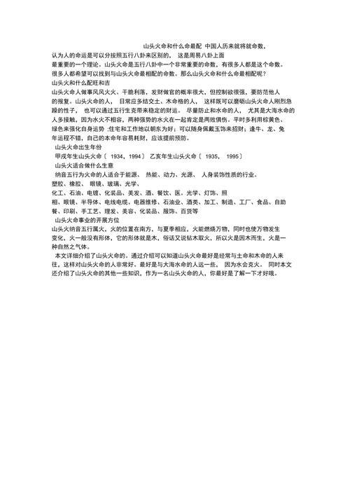 山头火命,源于中国传统的命理学,是一种以五行相生相克原理为基础的命理体系。这种命理体系认为,人的命运受到出生时间的影响,而山头火命的男人,其性格特点和适合的伴侣类型,也有着独特的命理解析。