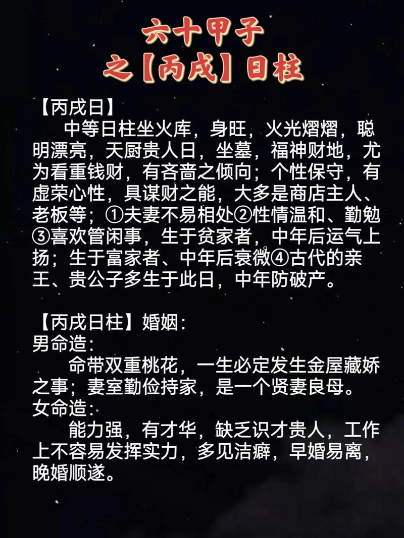 我们来了解一下丙戌日柱的特质。丙戌日柱由火土组合而成,丙火为阳火,戌土为阳土,两者相生相克,形成了一种既互补又矛盾的组合。丙火代表着热情、活力和创造力,而戌土则象征着稳重、踏实和包容。这种组合使得丙戌日柱的人性格中既有热情的一面,也有稳重的一面。